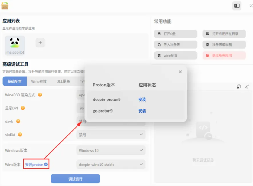 自 V3.3 版本起,统信 Windows 应用兼容引擎默认采用 deepin-wine10-stable,大幅提高应用兼容成功率(此前 V3.2 版本无法直接运行的腾讯 IMA 等部分软件,现已支持直接双击运行)。对于仍需旧版 wine 的应用,可以通过“高级调试”功能手动切换 wine 版本进行调试运行。