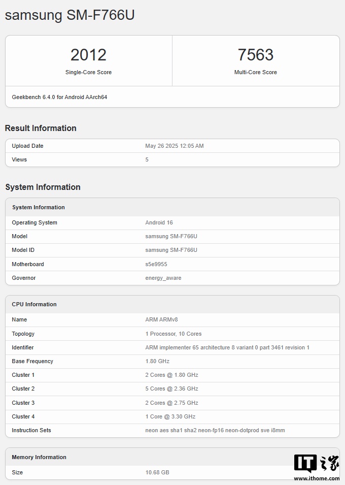 ▲ 外媒此前曝光的三星 Galaxy Flip7 渲染图Galaxy Z Flip7 折叠屏手机已现身 GeekBench 跑分库,6.4.0 版本单核成绩为 2012 分,多核成绩为 7563 分。CPU 规格为 1 Core @ 3.30 GHz、2 Cores @ 2.75 GHz、5 Cores @ 2.36 GHz、2 Cores @ 1.80 GHz,测试机型搭载 Android 16、12GB RAM。
