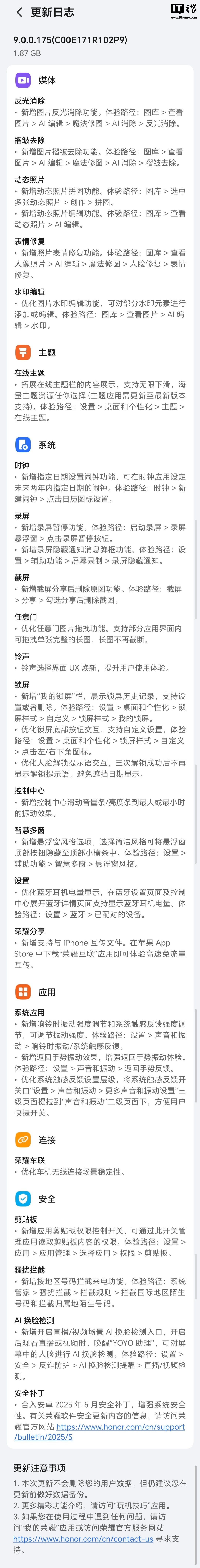 IT之家 5 月 30 日消息,荣耀 Magic7 系列手机今日推送 9.0.0.175 版本更新,本次更新图库新增反光消除、褶皱去除表情修复、水印编辑功能,支持动态照片拼图、编辑功能,新增支持与 iPhone 互传文件等。此外,有网友反馈荣耀 GT Pro、Magic6 等机型也推送了该版本。
