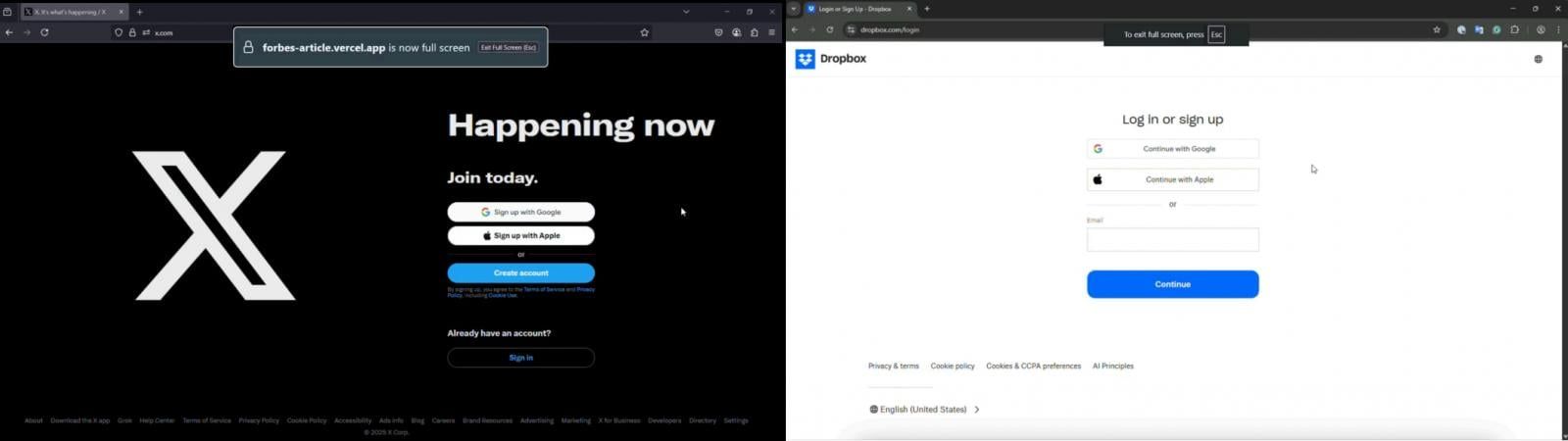 SquareX 团队指出,攻击者可以利用 BitM 技术,通过 Fullscreen API 操控网页内容进入全屏模式,隐藏地址栏等关键防护标识。