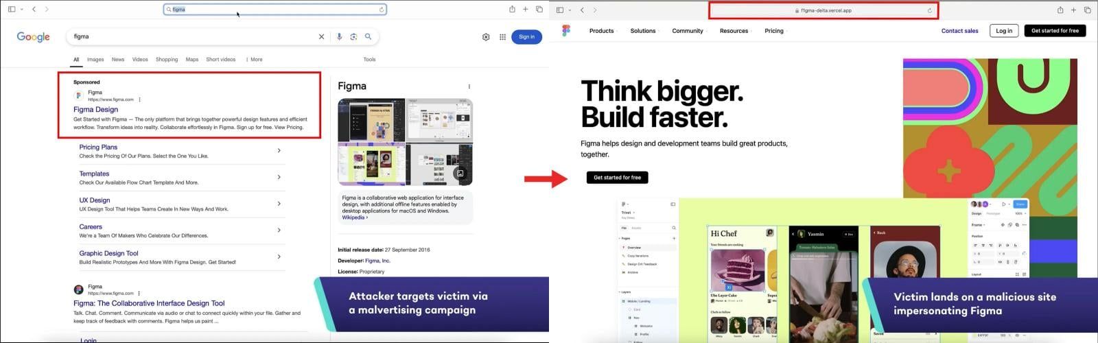 一旦用户输入凭据,这些信息直接落入攻击者手中,而用户仍能成功登录账户,毫无察觉被盗风险。攻击者常通过浏览器赞助广告、社交媒体帖子或评论推广虚假链接,例如伪装成 Figma 的网站,轻松诱骗用户上钩。