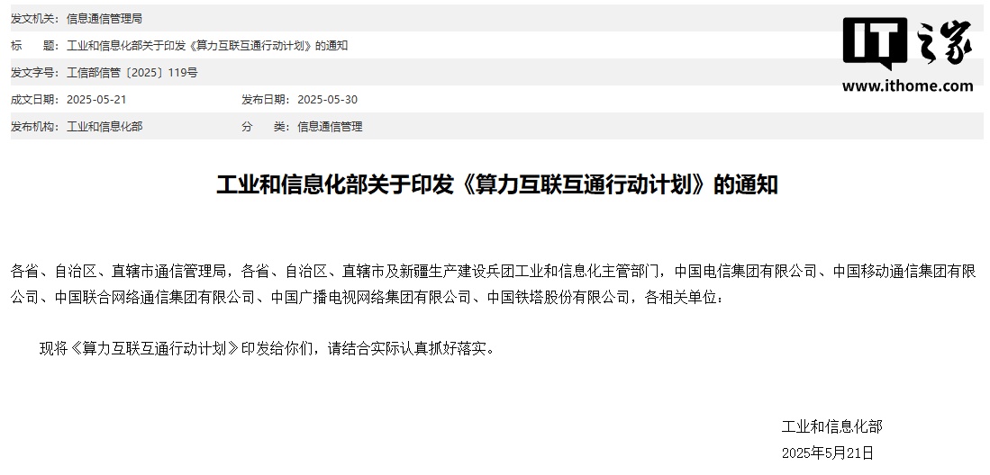 IT之家 5 月 30 日消息,工信部今日印发《算力互联互通行动计划》。到 2026 年,建立较为完备的算力互联互通标准、标识和规则体系。到 2028 年,基本实现全国公共算力标准化互联,逐步形成具备智能感知、实时发现、随需获取的算力互联网。