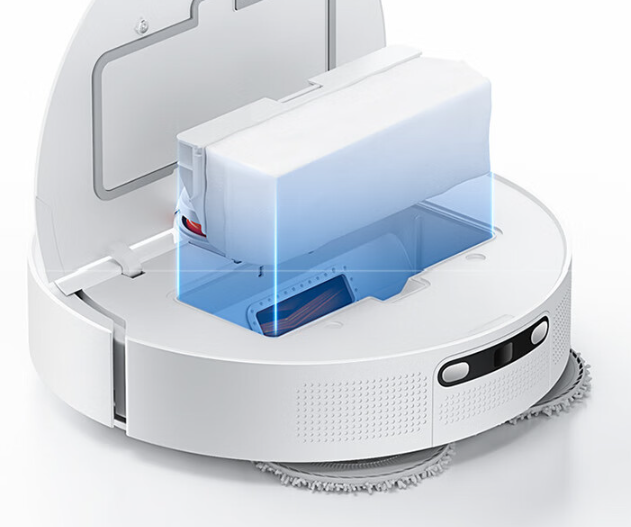 基座方面,新品支持拖布自动清洗,3 挡回洗频率可调;配备 4L 水箱,主机可湿拖 500㎡;基座底部配备一体式清洗盘,可拆卸设计方便清洗,还可通过米家 App 实现基座辅助冲洗。