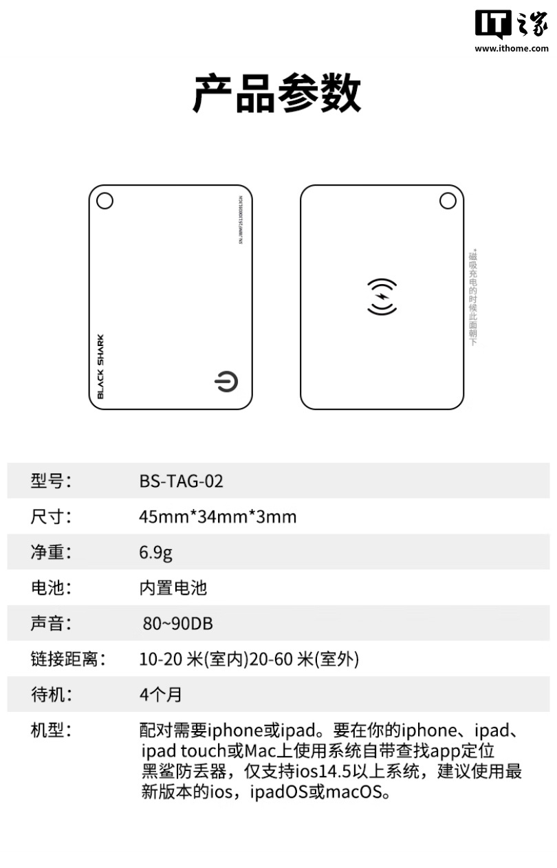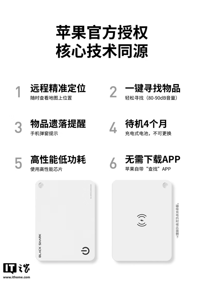 IT之家 5 月 30 日消息,黑鲨现已在京东上架一款卡片式定位追踪器,兼容苹果 Find My 查找网络,定价为 129 元,晒单返 20 元 E 卡,到手低至 109 元。
