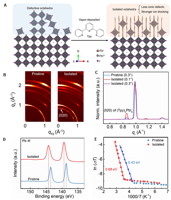 该团队开发出更绿色、更具经济性的“气相辅助表面重构”技术,相较于前代气相氟化技术,新方法无需专用设备,仅通过气相沉积多齿配体即可实现钙钛矿表面结构的原位重构,隔离缺陷富集的表面单元,实现离子不可逆迁移的抑制。