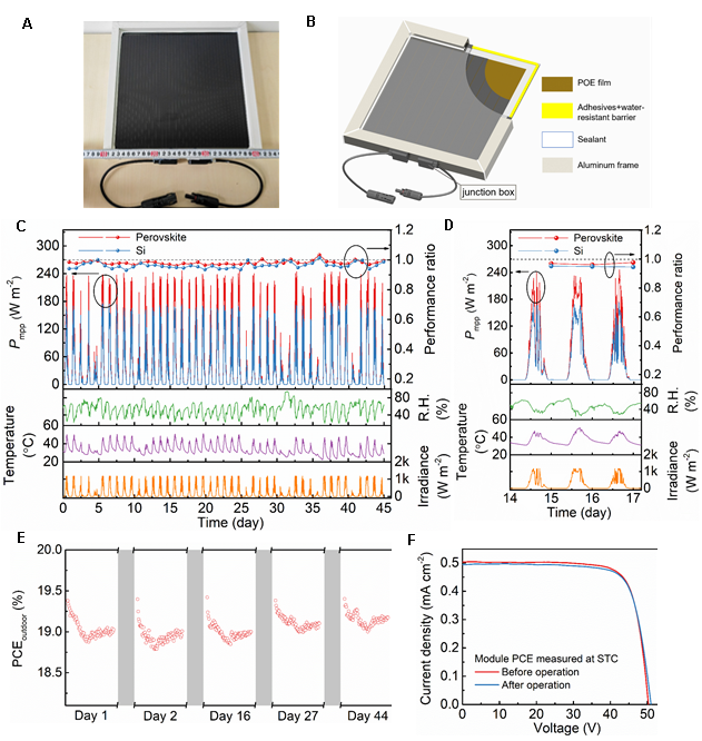 为了进一步考察钙钛矿模组的户外稳定性,在高温高湿的夏季将钙钛矿模组和商用晶硅太阳能电池一起对比,发现产业级钙钛矿模组展示出与商用晶硅太阳能电池相当的稳定性。并且由于钙钛矿电池较低的温度系数,其在高温条件下的功率保持率甚至优于晶硅太阳能电池,证明了钙钛矿太阳能电池实际应用的可能性。