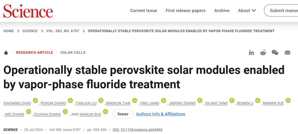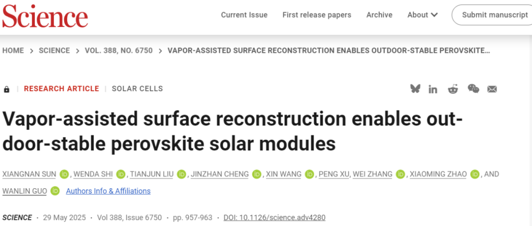 IT之家 5 月 30 日消息,据南京航空航天大学今日消息,该校国际前沿科学研究院郭万林教授和赵晓明教授团队继 2024 年 7 月开发气相氟化技术实现大面积钙钛矿太阳能电池的均匀稳定化后,于 2025 年 5 月 30 日再次在《Science》发表最新成果“Vapor-assisted surface reconstruction enables outdoor-stable perovskite solar modules”。