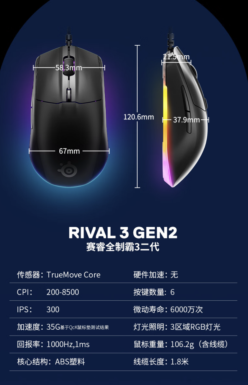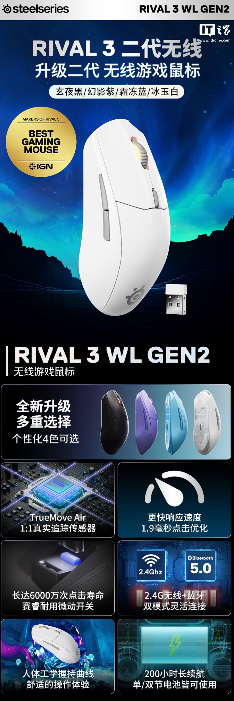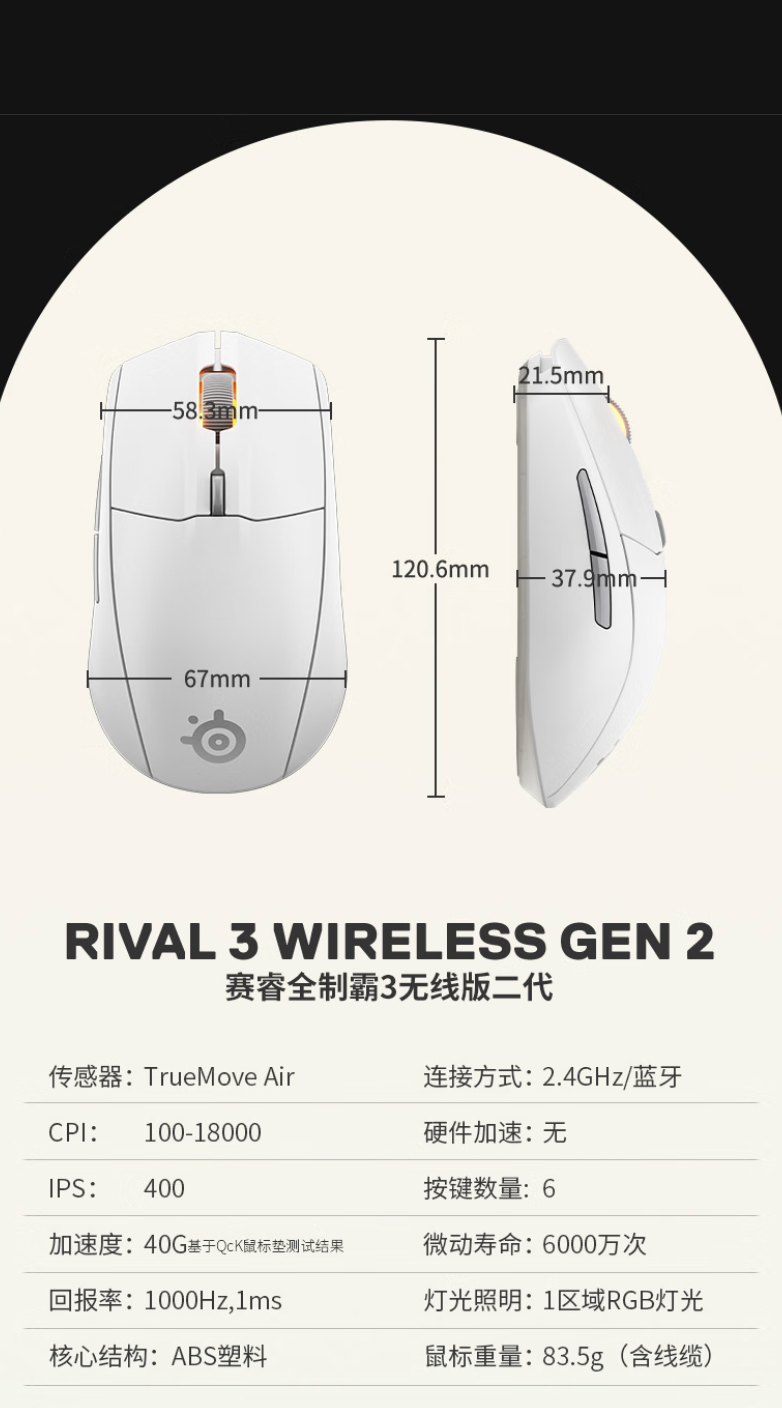 ▲ Rival 3 Gen 2Rival 3 Wireless Gen 2 则采用 2 节 AAA 电池供电,标称质量为 83.5g,其搭载了 18000 DPI 的 TrueMove Air 光学传感器,延迟则为 1.9ms,鼠标支持 2.4GHz & BT 5.0 双模连接,续航分别为 200 小时和 450 小时,没有底部 RGB 灯效。