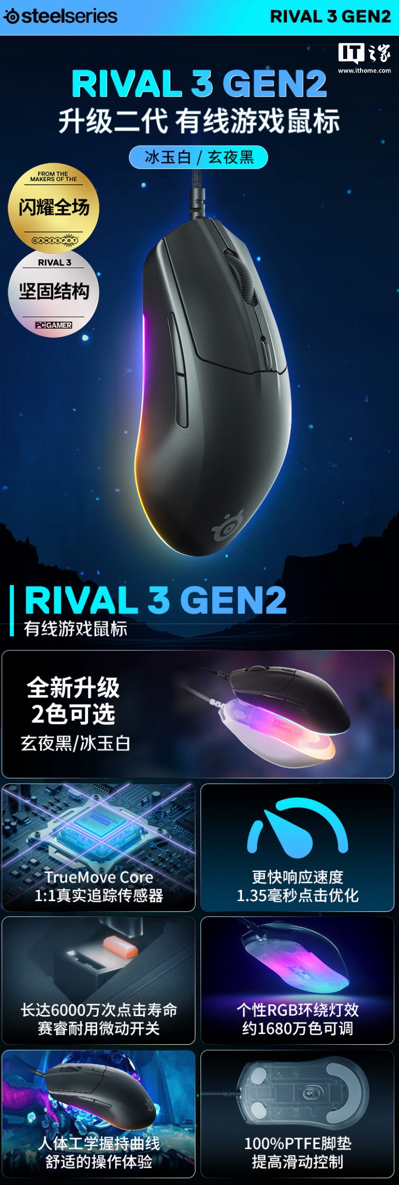 据介绍,赛睿 Rival 3 Gen 2 鼠标采用右手人体工学模具设计,提供有线和无线双版本,均配备 60M 敲击寿命机械微动。