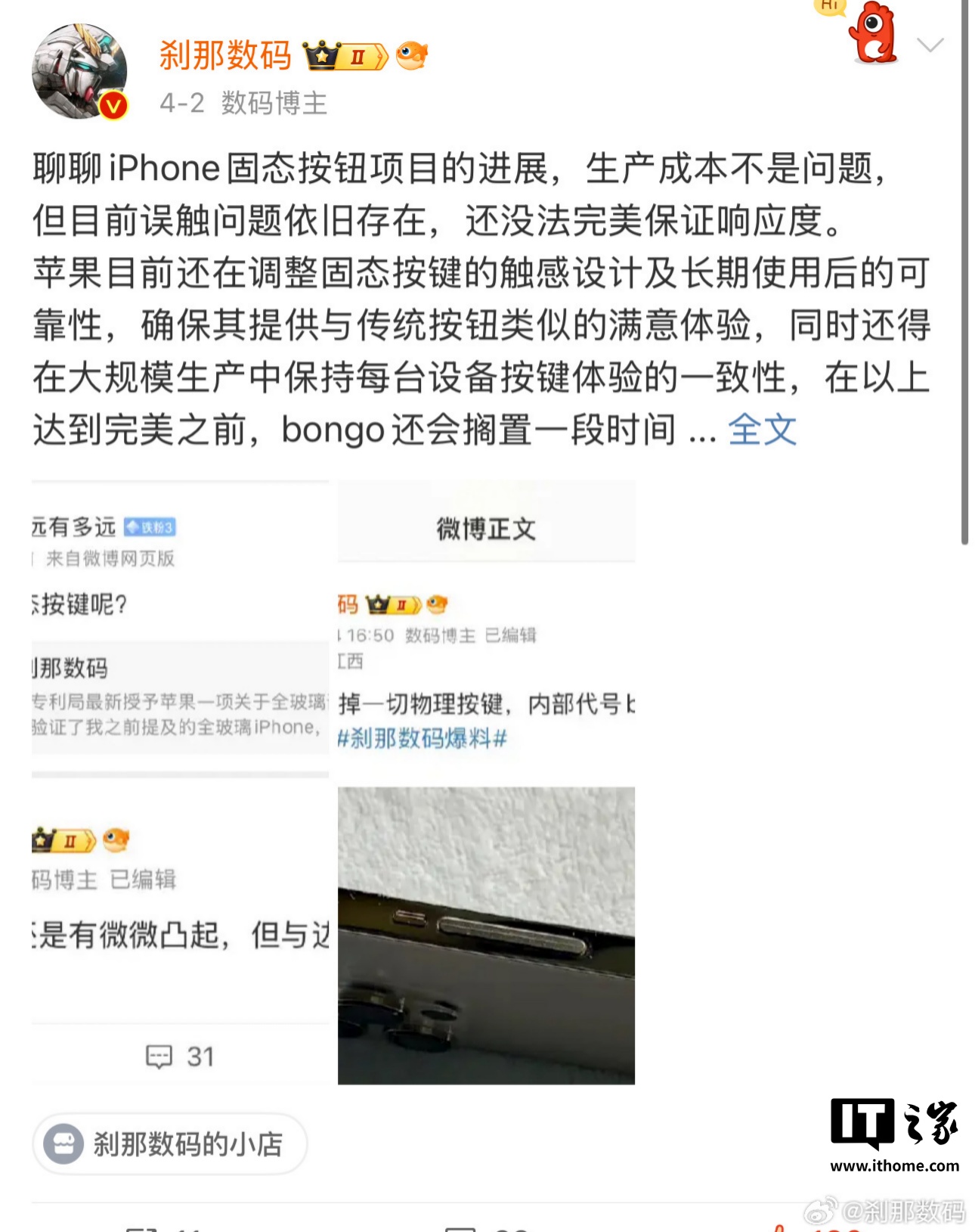 IT之家 5 月 30 日消息,据博主 @刹那数码 今日爆料,苹果内部代号 bongo 的项目重启,不止 iPhone,苹果开始对全产品线探索触觉按钮方案,包括 iPad、Apple Watch。