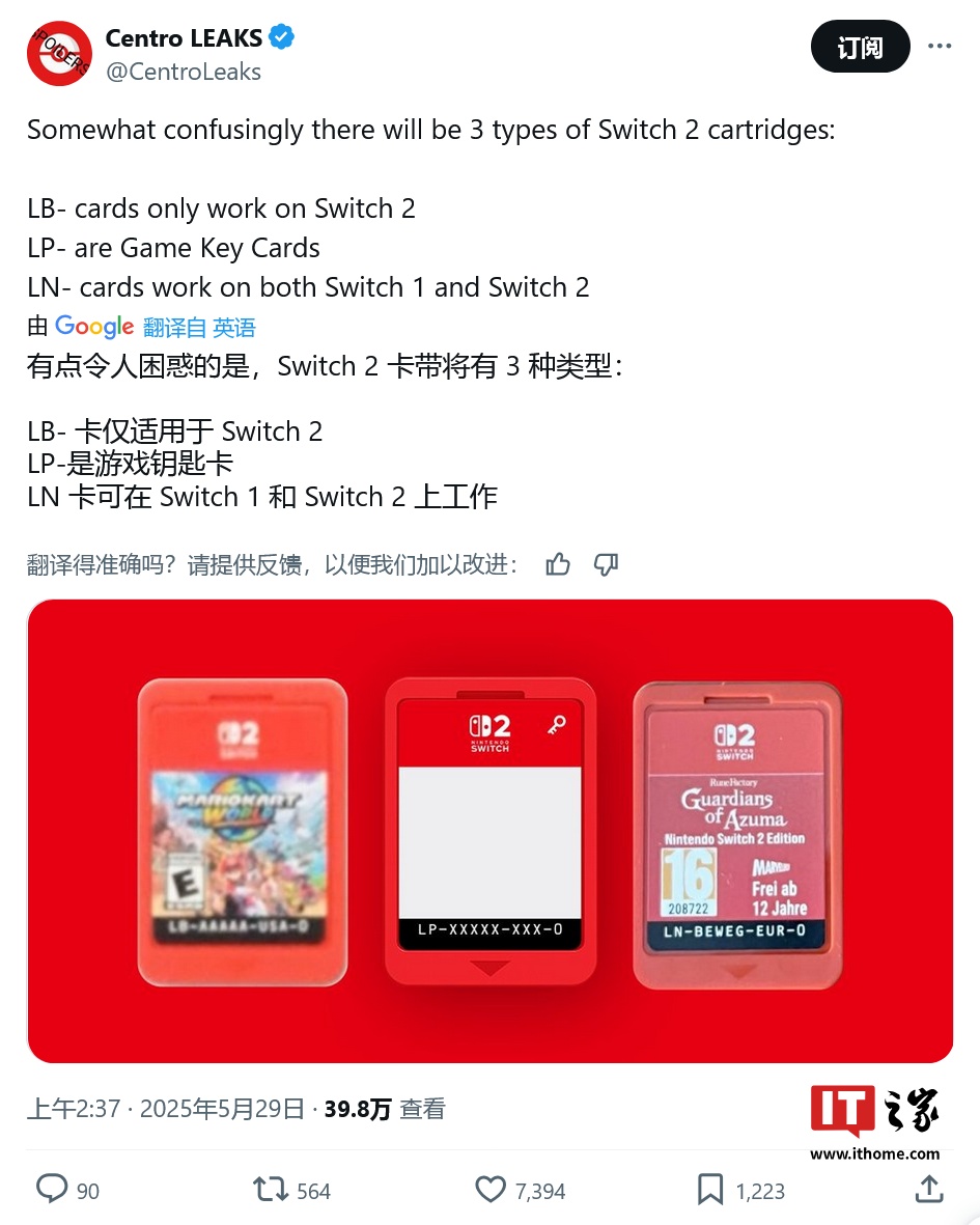IT之家 5 月 31 日消息,消息源 @CentroLeaks 于 5 月 29 日在 X 平台发布推文,曝料称任天堂 Switch 2 游戏掌机会有 3 种不同类型的游戏卡带,均采用标志性的红色外壳,并通过卡带正面贴纸上的代码加以区分。
