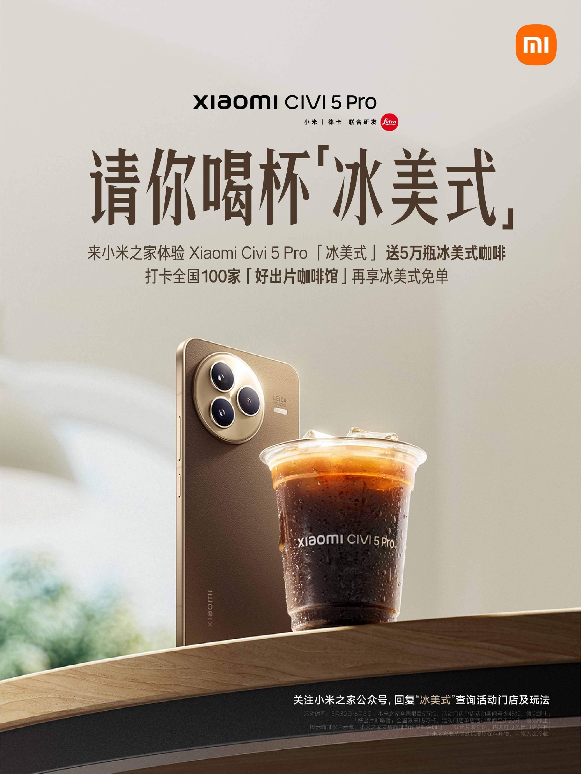 IT之家 5 月 31 日消息,小米之家宣布开启免费领取冰美式咖啡活动,限量 5 万瓶。活动时间即日起至 6 月 8 日,官方称活动期间到小米之家体验 Xiaomi Civi 5 Pro 手机,并在社交媒体晒图即可获得相应咖啡。活动门店单店活动期间至少 45 瓶,领完即止。