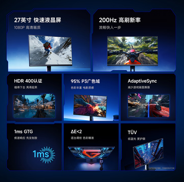 据介绍,这款新品配备一块 27 英寸 1920x1080 分辨率 200Hz Fast IPS 面板,显示器峰值亮度 400 尼特,静态对比度 1000:1,GtG 响应速度 1ms,显示器支持 8-Bit 色彩,覆盖 100% sRGB 和 95% DCI-P3 色域,支持 AdaptiveSync 同步技术。
