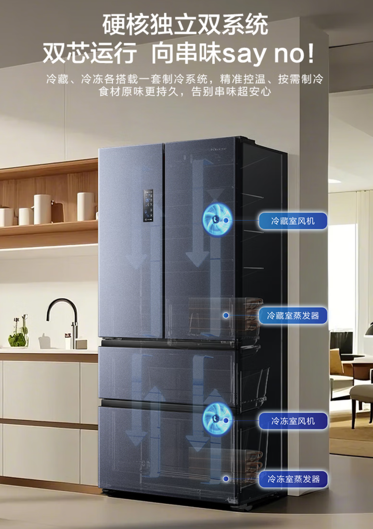 这款冰箱采用双系统双循环架构,冷冻冷藏室分别各有一套蒸发器,分区制冷有效防止串味。