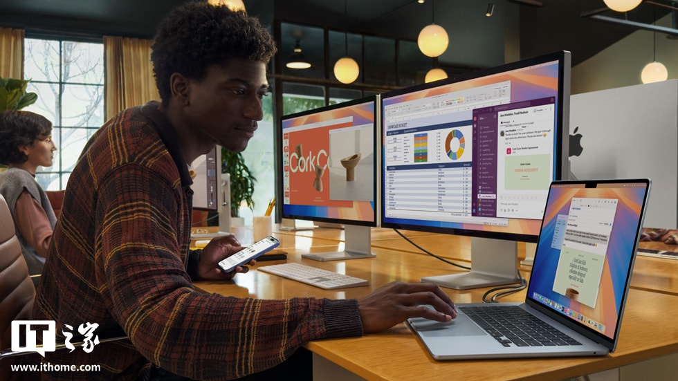 新款 MacBook Air 支持在屏幕打开状态下连接两台 6K 外部显示器,加上内置显示器,可满足用户多屏显示的需求。