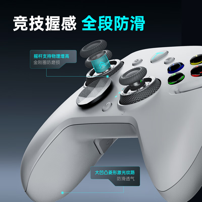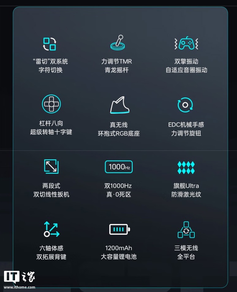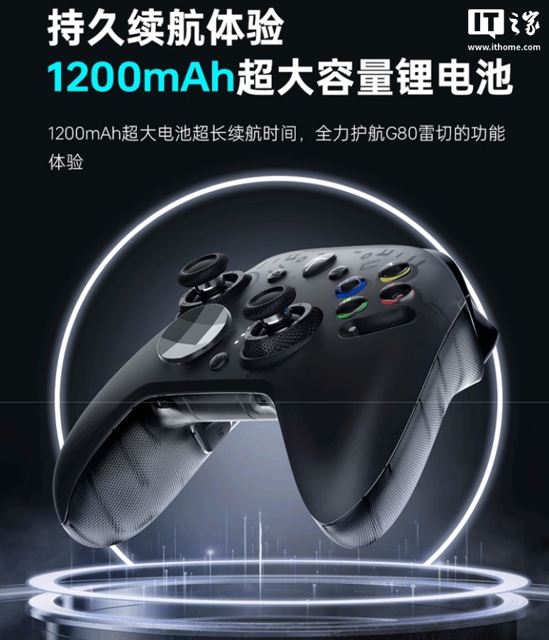雷神 G80 雷切双系统手柄内置 1200mAh 电池,配备杠杆八向超级转轴十字键、EDC 机械手感力调节旋钮、两段式双切线性扳机、旗舰 Ultra 防滑激光纹、六轴体感双拓展背键,支持有线 / 2.4G 双 1000Hz 回报率、三模多平台连接(PC / NS / 手机 / TV / 部分车机平台)。