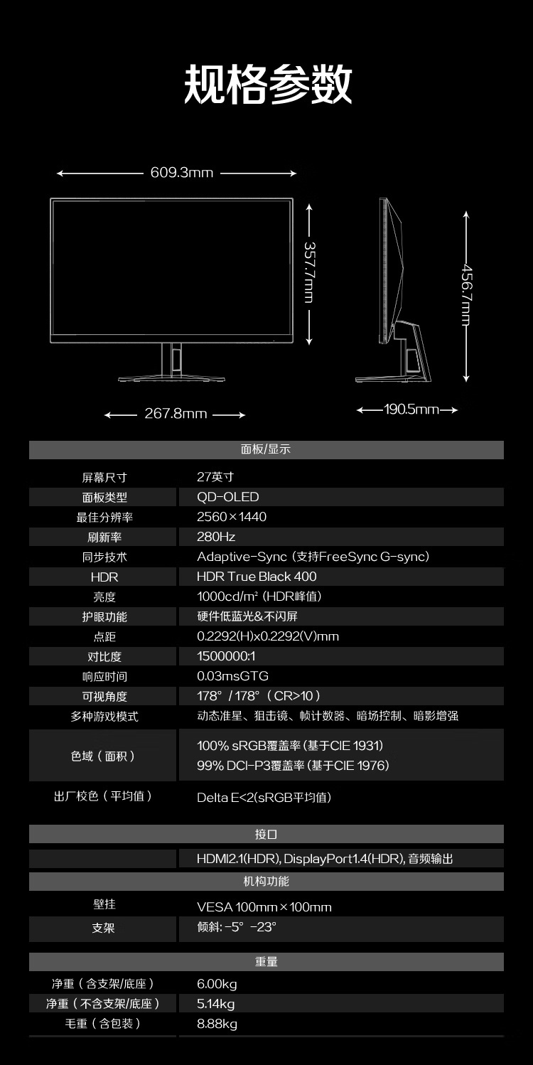 这款显示器采用了 26.5 英寸的 QD-OLED 面板,具备 2560 x 1440 分辨率、280Hz 刷新率、1000 cd / m² 峰值亮度、原生 10bit 色深、可视角度 178°(水平和垂直),带防眩光设计。