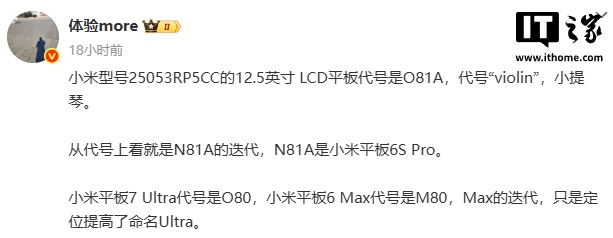 IT之家 6 月 1 日消息,博主 @体验more 昨日爆料称,小米型号 25053RP5CC 的 12.5 英寸 LCD 平板代号是 O81A,代号“violin(小提琴)”。从代号上看就是 N81A 的迭代,而 N81A 是小米平板 6S Pro。