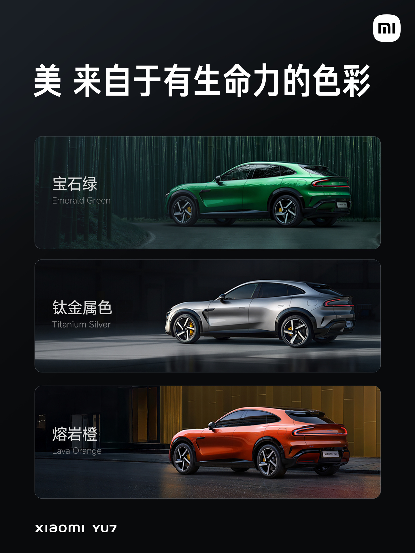 IT之家注意到,官方透露小米 YU7 除了已公布的钛金属色、宝石绿、熔岩橙和寒武岩灰外,还有五款颜色即将发布。