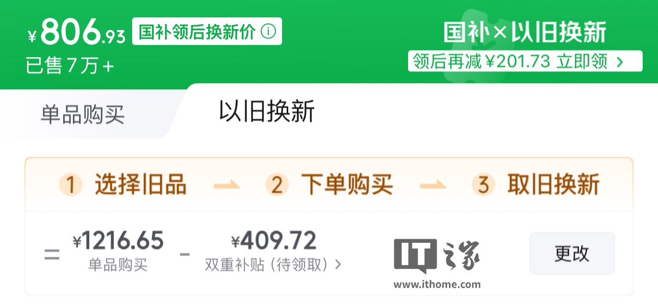 国补后实付约 973.32 元,以旧换新补贴后实付约 806.93 元。