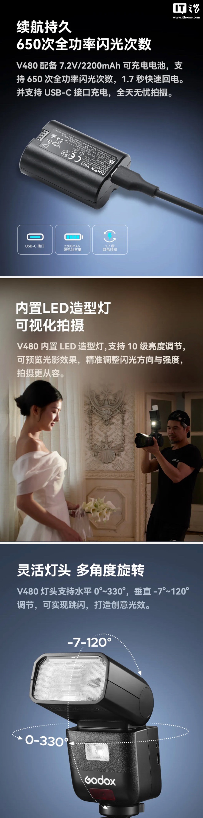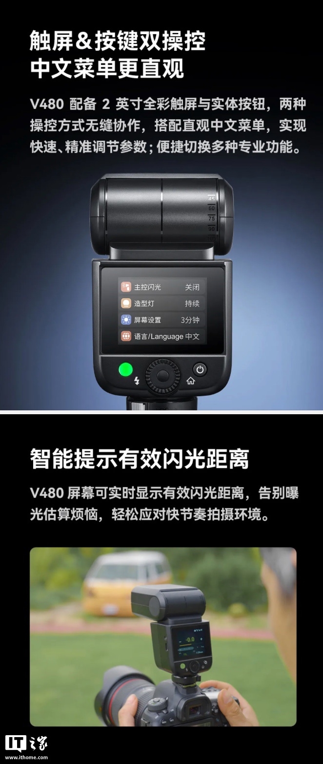 IT之家 6 月 1 日消息,Godox 神牛官方公众号现已官宣一款 V480 TTL 闪光灯,这款闪光灯可容纳 GN50 输出,回电速度 1.7 秒,支持 1/8000 秒同步,支持 2.4G X 系统,定价 898 元。