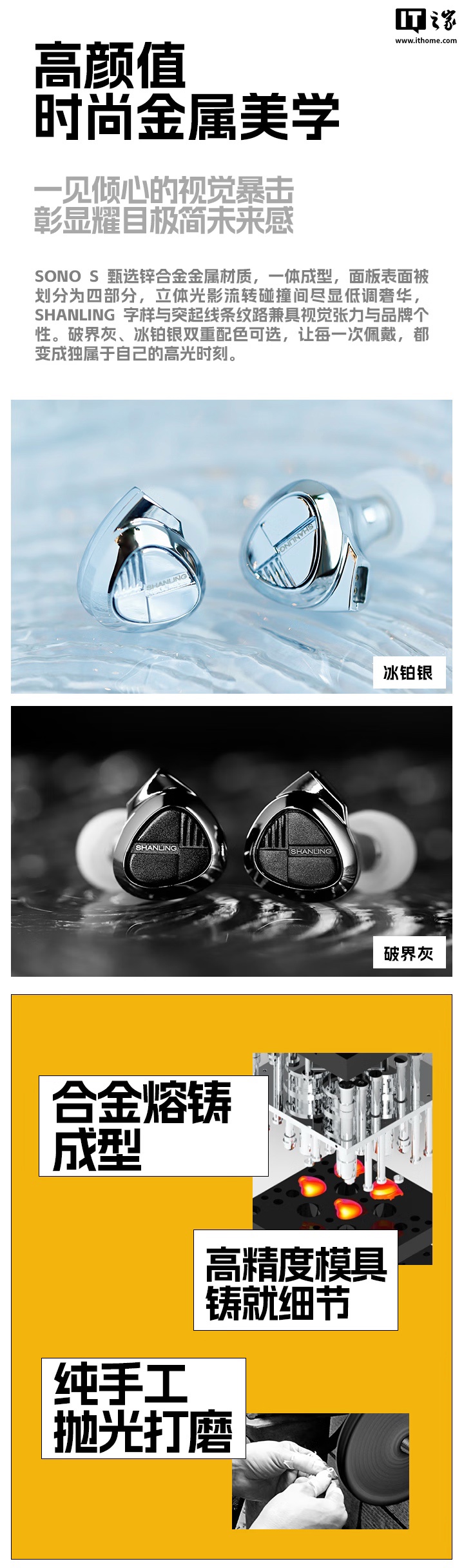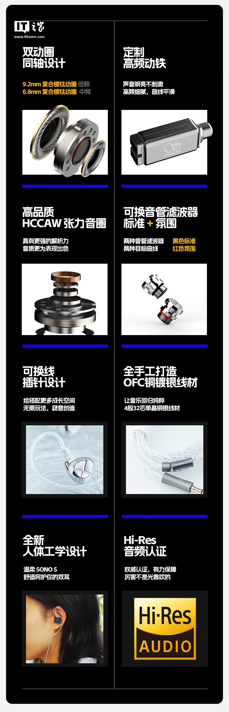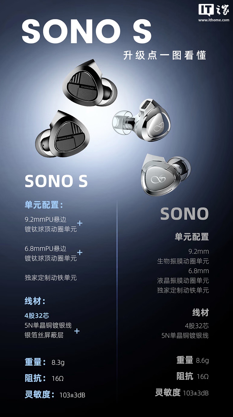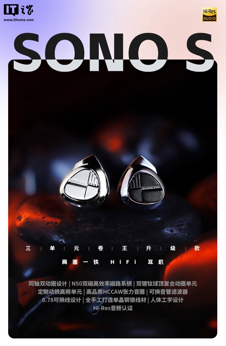 IT之家 6 月 1 日消息,山灵现已推出一款 SONO S Hi-Fi 入耳式耳机,该耳机主打双动圈设计,定价为 428 元。