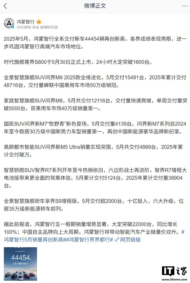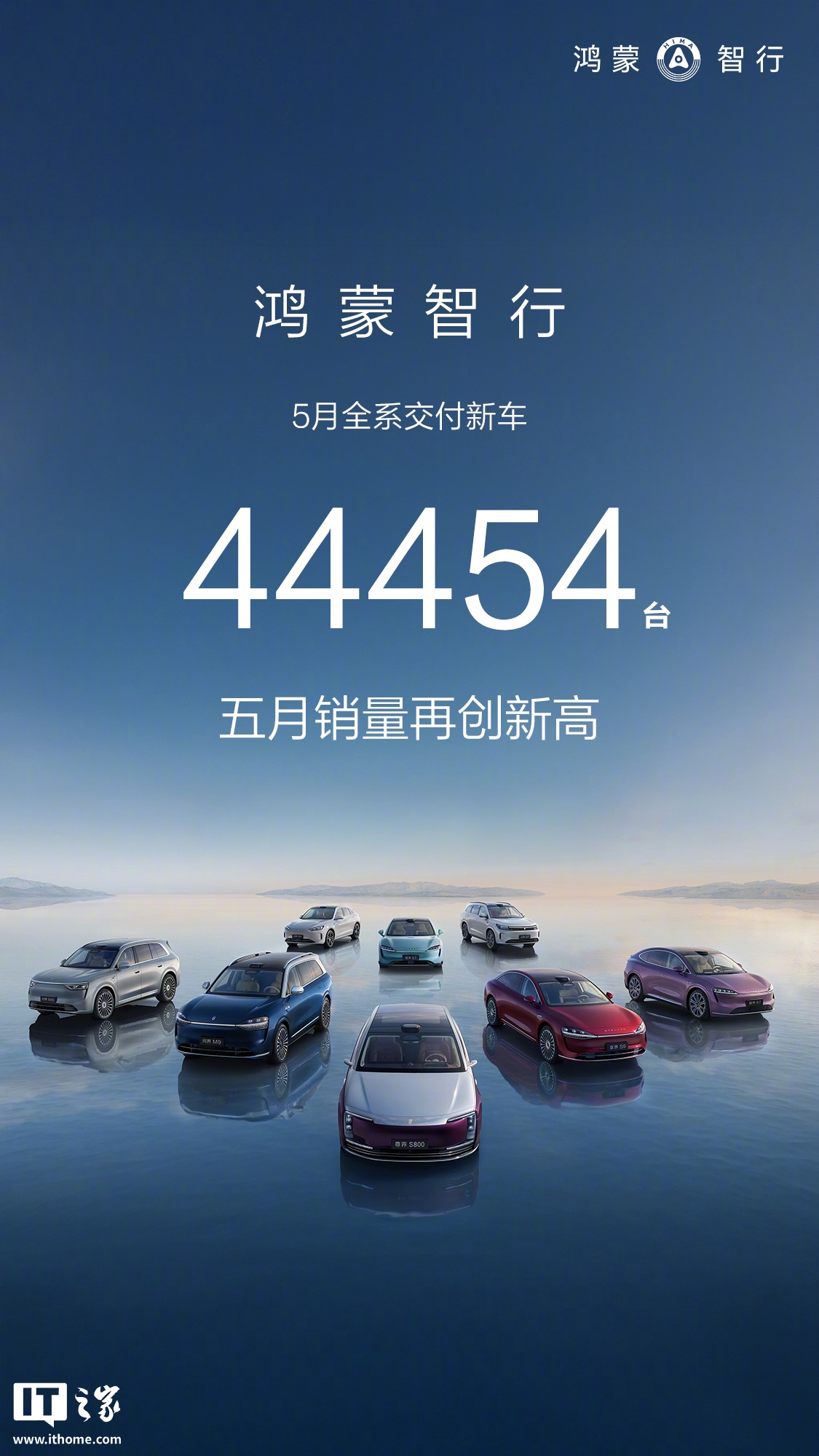 IT之家 6 月 1 日消息,鸿蒙智行官方微博今日发文宣布:2025 年 5 月,鸿蒙智行全系交付新车 44454 辆再创新高,各界成绩表现亮眼,进一步巩固鸿蒙智行高端汽车市场地位。