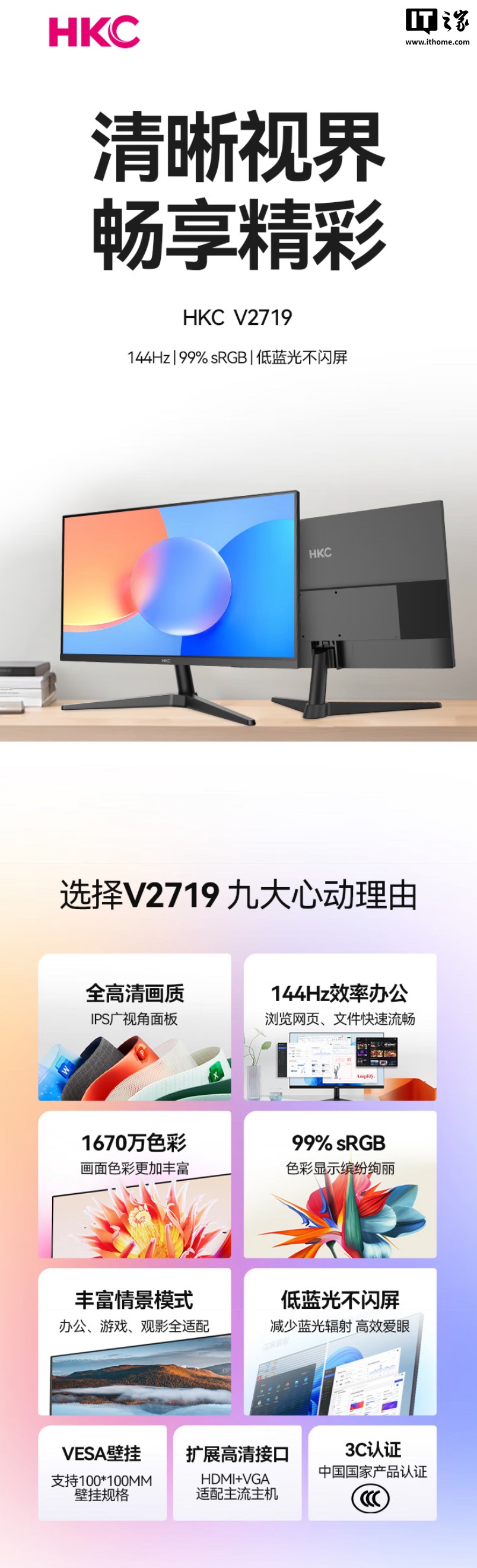IT之家 6 月 2 日消息,HKC 现已在京东上架一款型号为“V2719”的 27 英寸显示器,该机主打“1080P 144Hz”,定价为 599 元。