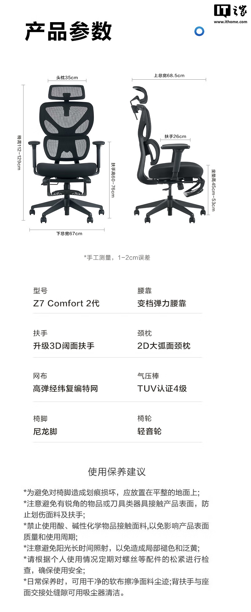 IT之家附该人体工学椅规格如下: