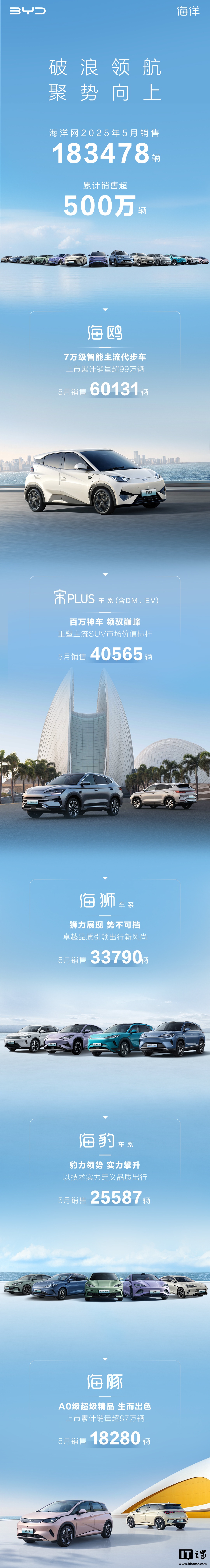 IT之家注意到,比亚迪汽车海洋网销售事业部总经理张卓今日发文宣布:比亚迪海洋网 5 月销售 183478 辆,同比增长 28.21%,累计销售破 500 万辆。