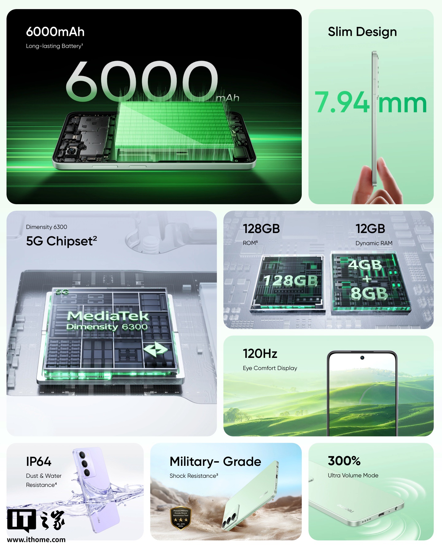 该机搭载联发科天玑 6300 芯片,匹配 4GB RAM 及 64/128GB 存储空间,内置 6000 毫安时电池,支持 15W 有线充电。此外手机拥有 MIL-STD-810H 认证,支持 300% 音量,搭载基于安卓 15 的 realme UI 6.0。