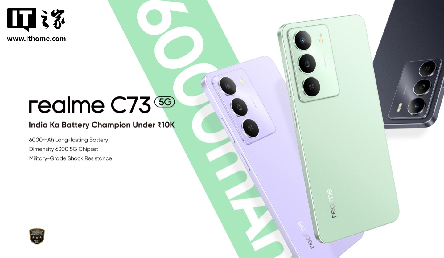 IT之家 6 月 2 日消息,realme 真我现已在海外推出一款 C73 手机,该机定位入门,采用联发科天玑 6300 处理器,匹配 4GB RAM,其中 64GB 存储空间版本定价为 10499 印度卢比(IT之家注:现汇率约合 884 元人民币),128GB 存储空间版本定价为 11499 印度卢比(现汇率约合 968 元人民币)。
