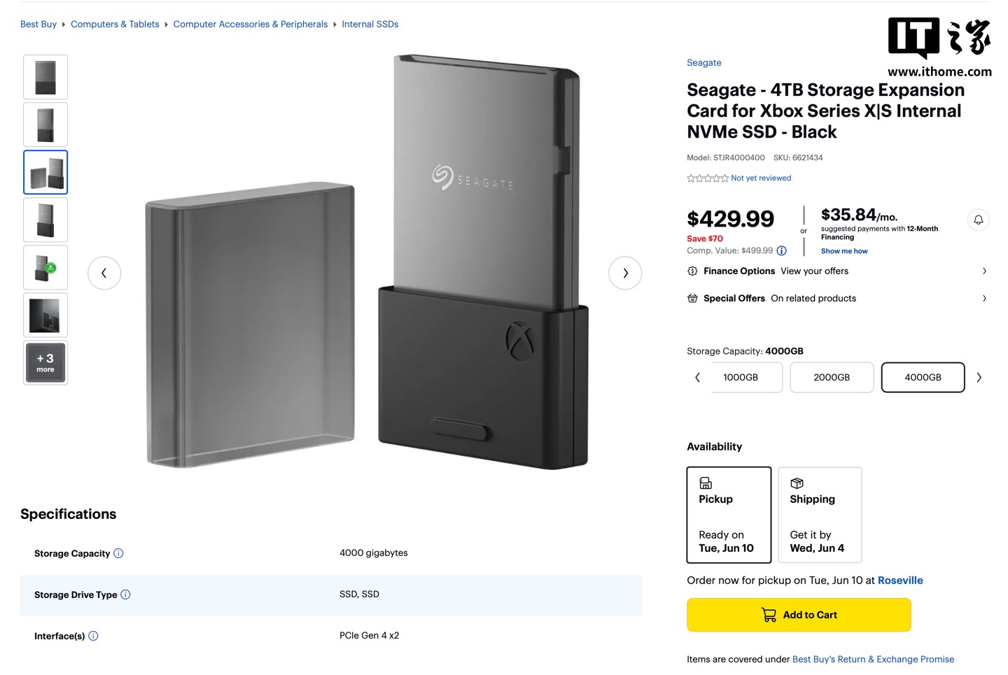 当下,希捷和微软都尚未就这款 4TB Xbox 存储卡发布任何官方公告,按照近期发布会时间表,这款存储卡有望在 6 月 8 日举行的 Xbox 游戏展示会中正式亮相。但即便如此,其实现在玩家就已经可以在百思买平台下单购买这款扩展卡,并等待 6 月 10 日时送达。