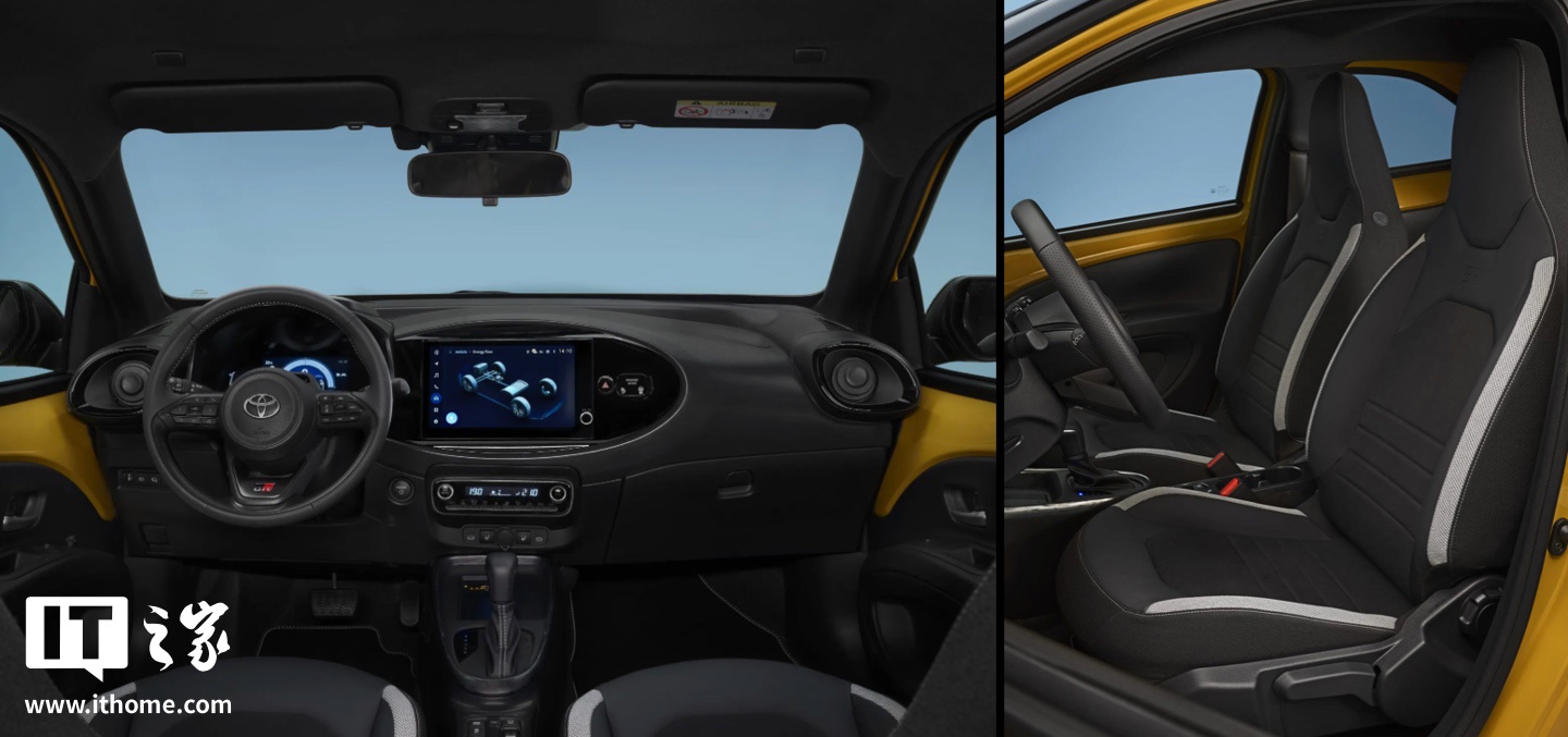 外观设计方面,Aygo X 主打一款 GR Sport 版,该版本车型使用“芥末黄”车漆,引擎盖进行黑化处理,配有新款“G 形”前格栅和 18 英寸 GR Sport 专属轮毂,整体设计灵感号称来自丰田世界冠军车队 Gazoo Racing。