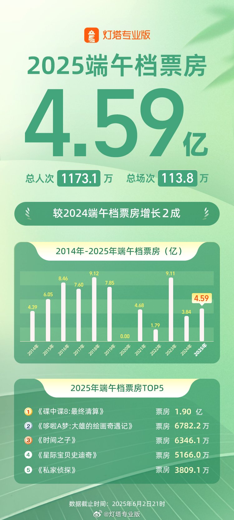 IT之家 6 月 2 日消息,据灯塔专业版,截至 6 月 2 日 21 时,2025 年端午档票房 4.59 亿,较 2024 年端午档票房同比增长 2 成,《碟中谍 8:最终清算》档期内票房 1.90 亿(累计 2.28 亿),夺得 2025 端午档票房冠军。