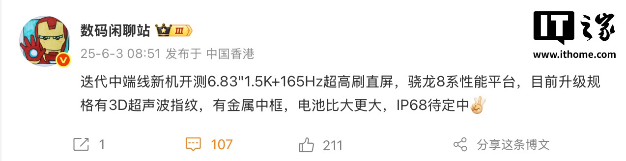 IT之家 6 月 3 日消息,博主 @数码闲聊站 发文,透露某厂商迭代中端线新机开测 6.83 英寸 1.5K 165Hz 超高刷直屏,搭载“骁龙 8 系性能平台”,目前升级规格有“3D 超声波指纹、金属中框、大电池”,同时有望具备 IP68 认证。