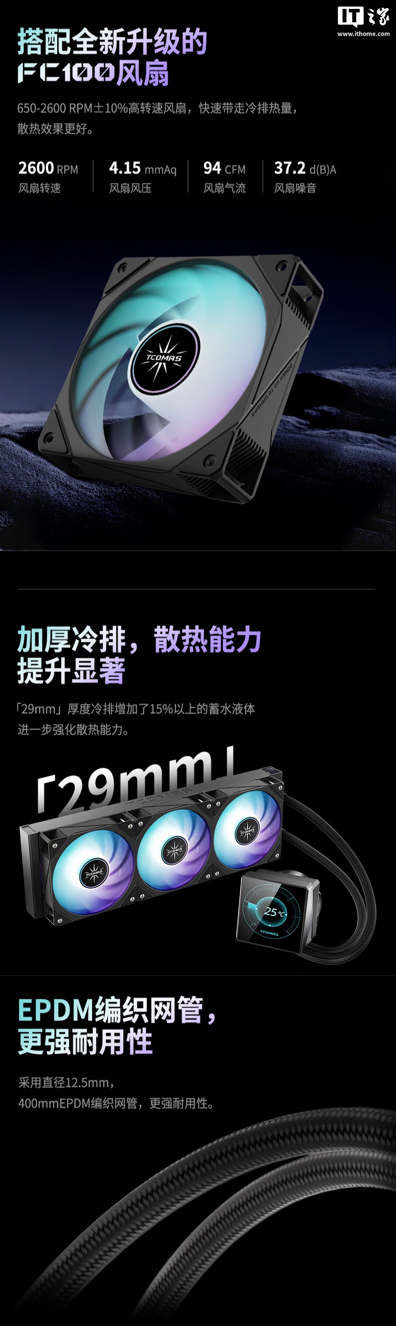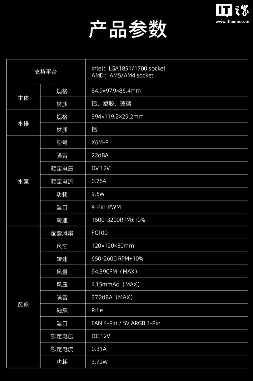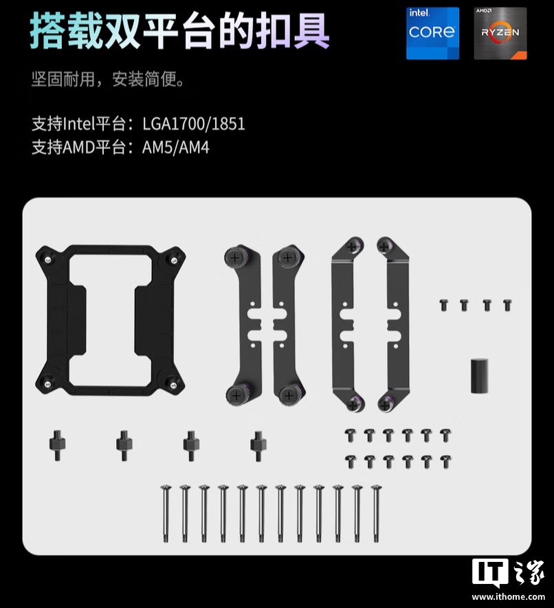此外,该水冷采用 EPDM 编织网管,直径达 12.5mm,长 400mm,水冷的标配扣具支持 Intel LGA1851/1700 和 AMD AM4 / AM5 主流双平台。