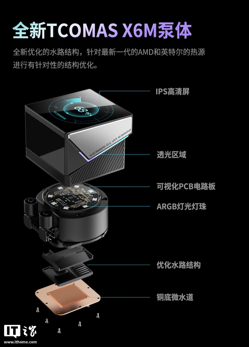 该冷头内采用了钛钽旗舰同款的 X6M-P 水泵,号称针对最新一代 AMD 和英特尔处理器热源优化,转速 3200RPM±10%,支持 4pin PWM 调速,可提供较好的水冷液循环。冷头铜底预涂 TGB-300 硅脂。