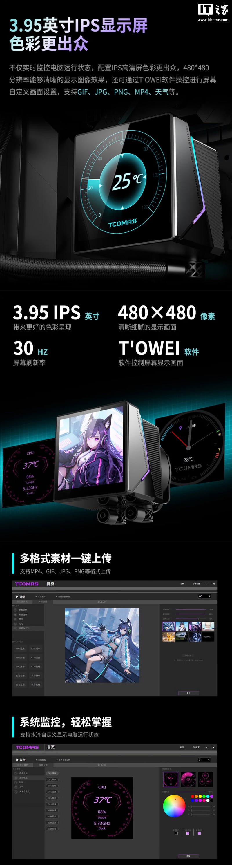 据介绍,该散热器冷头配备一块 3.95 英寸 480x480 分辨率 30Hz IPS 面板,采用磁吸安装方式。支持通过 T'OWEI 软件自行配置。