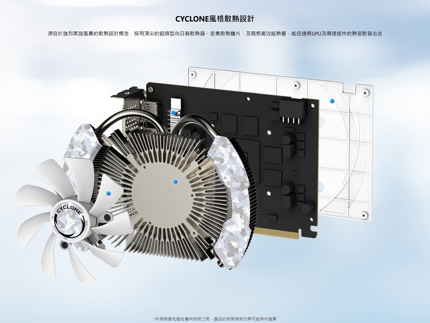 作为“旋风”系列的一员,这些显卡采用了经典的双热管铝挤鳍片向日葵散热器,配备单颗暴露在外的 100mm 九叶风扇。热管外侧的霜雪迷彩现代美学设计和怀旧的散热模具完美融合。