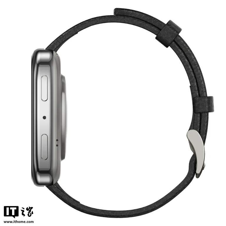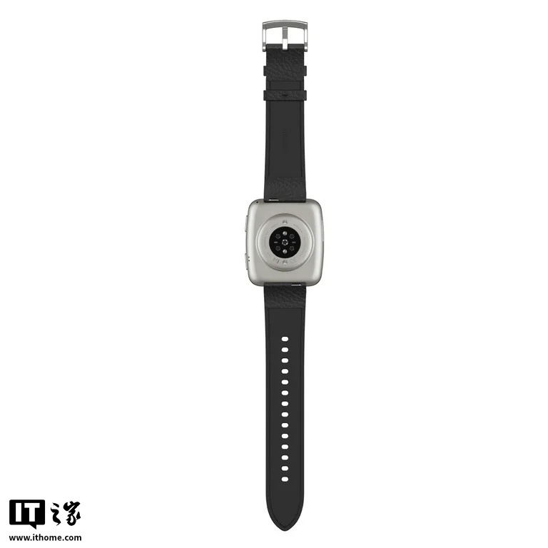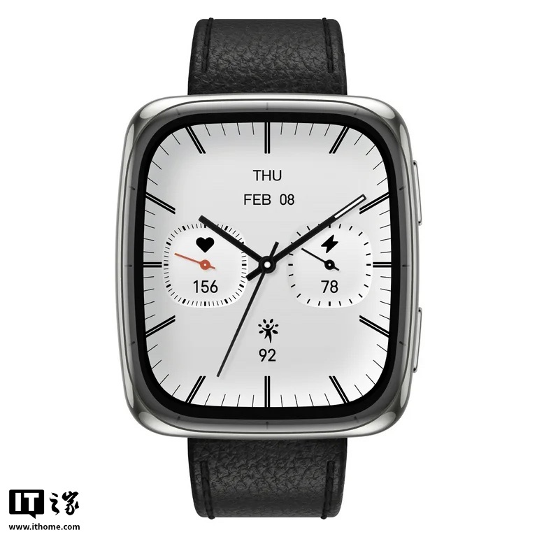 IT之家了解到,该手表搭载 1.75 英寸方形 AMOLED 屏幕,分辨率为 390*450,屏幕玻璃采用蓝宝石材质,同时外壳采用不锈钢材质,尺寸为 43.2*36.9*9 毫米,重量为 31.4 克;随附有皮革、硅胶表带。