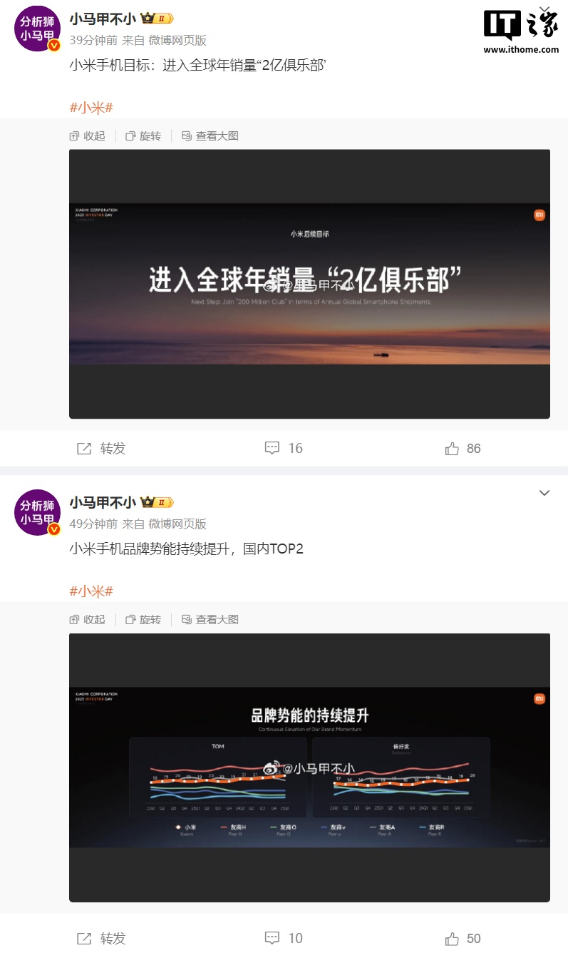 PPT 还显示,小米手机后续目标进入全球年销量“2 亿俱乐部”,小米手机品牌势能持续提升,目前位列国内 TOP2。
