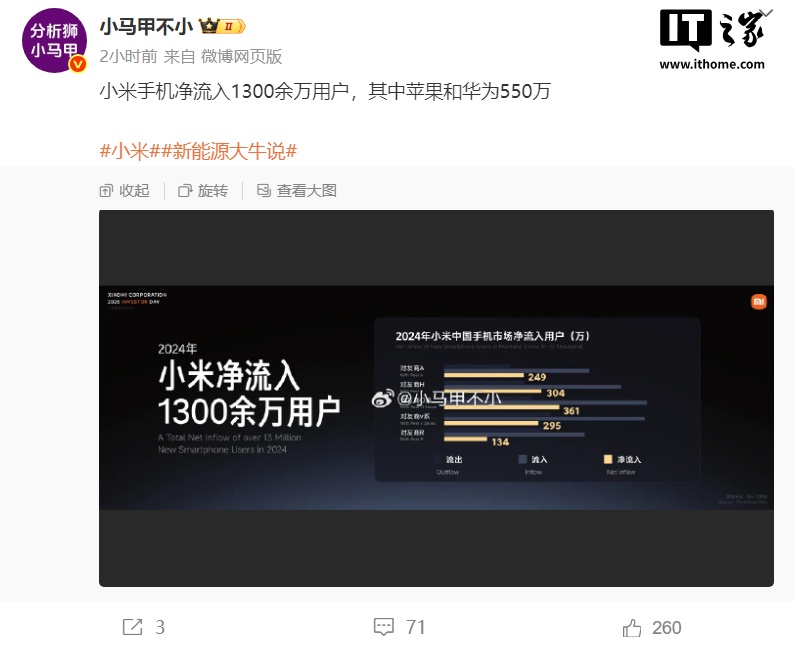 根据 PPT 信息,2024 年小米手机市场净流入 1300 余万用户,其中对比友商 A、H、O 系、v 系、R 都有净流入,该博主称“其中苹果和华为 550 万”。