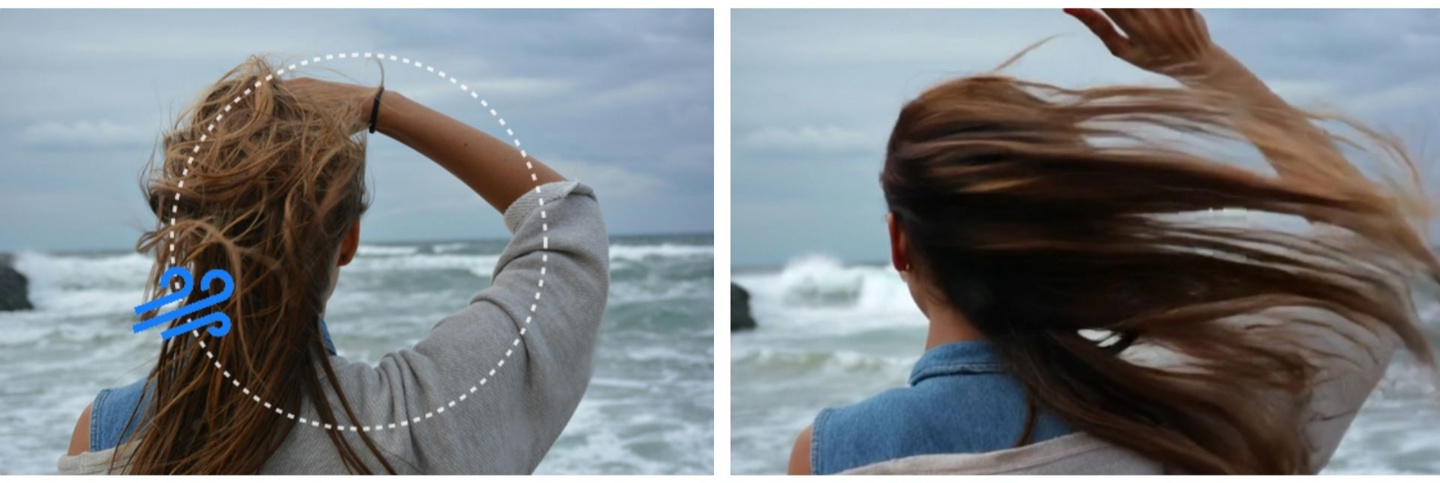用户只需指定力的方向和强度,就能操控 AI 生成的视频内容,该技术支持全局力(如风吹过整个画面)和局部力(如特定点的敲击)两种力量。这些力以矢量场形式输入系统,随后被转化为自然流畅的运动。
