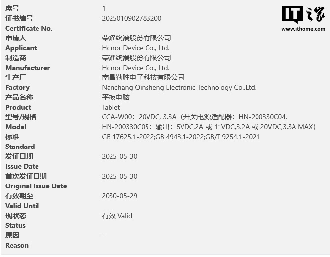 认证页面并未透露太多有用信息,只显示申请人和制造商为“荣耀终端股份有限公司”,生产厂为“南昌勤胜电子科技有限公司”,型号和规格为“CGA-W00:20VDC, 3.3A(开关电源适配器:HN-200330C04, HN-200330C05:输出:5VDC,2A 或 11VDC,3.2A 或 20VDC,3.3A MAX)”。