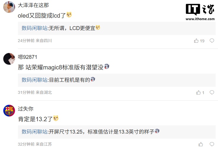 博主还在评论区回复了部分网友的问题:针对荣耀 Magic8 标准版新机是否配备潜望镜头,博主称“目前工程机是有的”;针对新款平板的尺寸是否为 13.2 英寸,博主表示“开屏尺寸 13.25,标准值估计是 13.3 英寸的样子”。