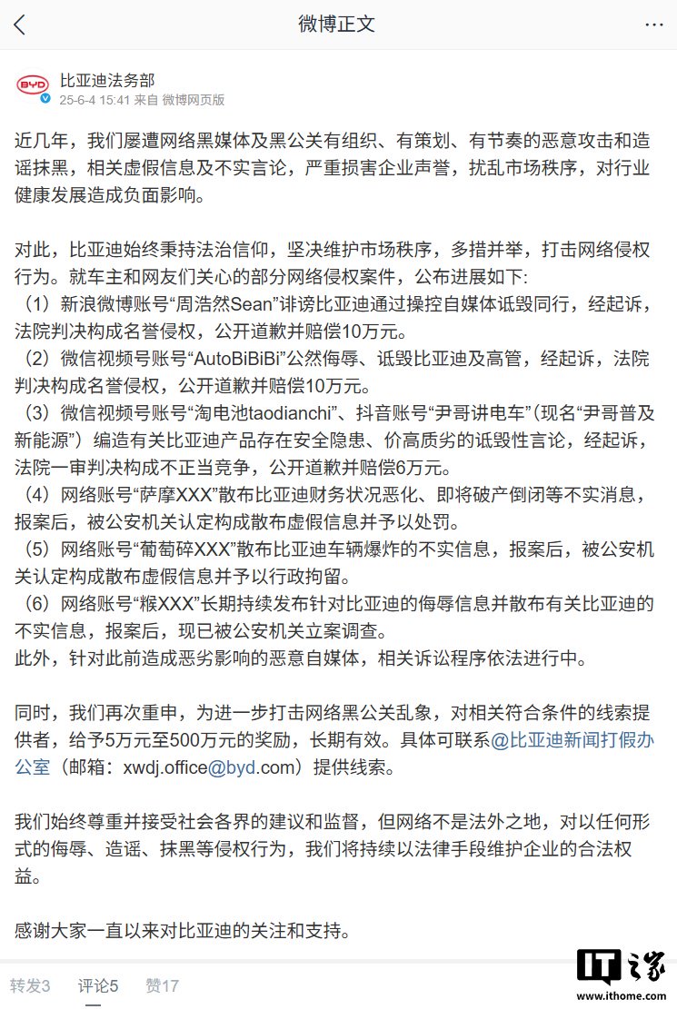 IT之家 6 月 4 日消息,比亚迪法务部刚刚发布公告,就车主和网友们关心的部分网络侵权案件公布进展如下: