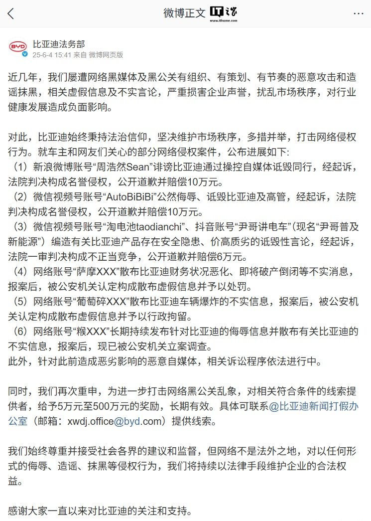 IT之家 6 月 4 日消息,比亚迪法务部今日公布了车主和网友们关心的部分网络侵权案件进展,并重申为进一步打击网络黑公关乱象,对相关符合条件的线索提供者,给予 5 万元至 500 万元的奖励,长期有效。