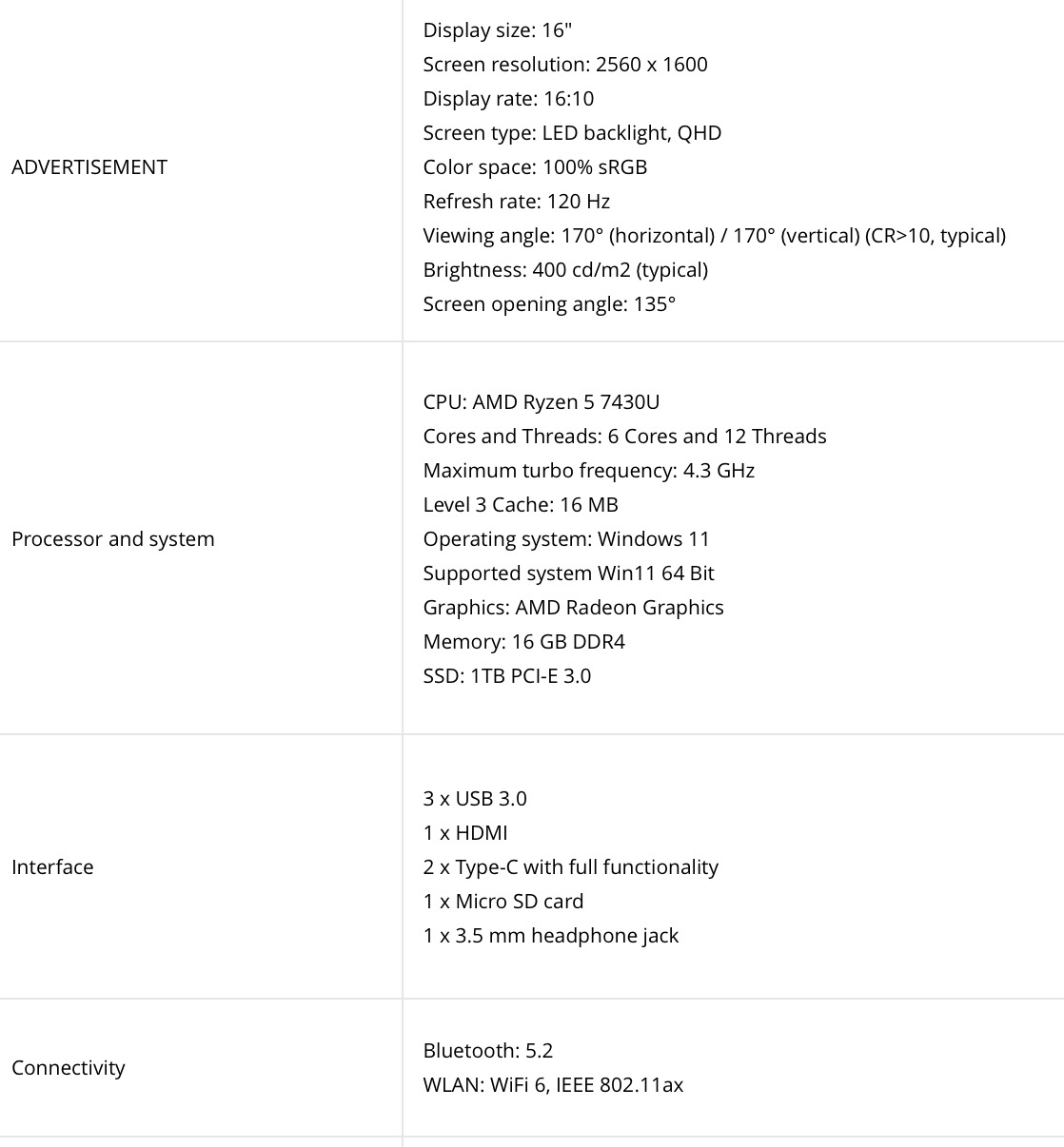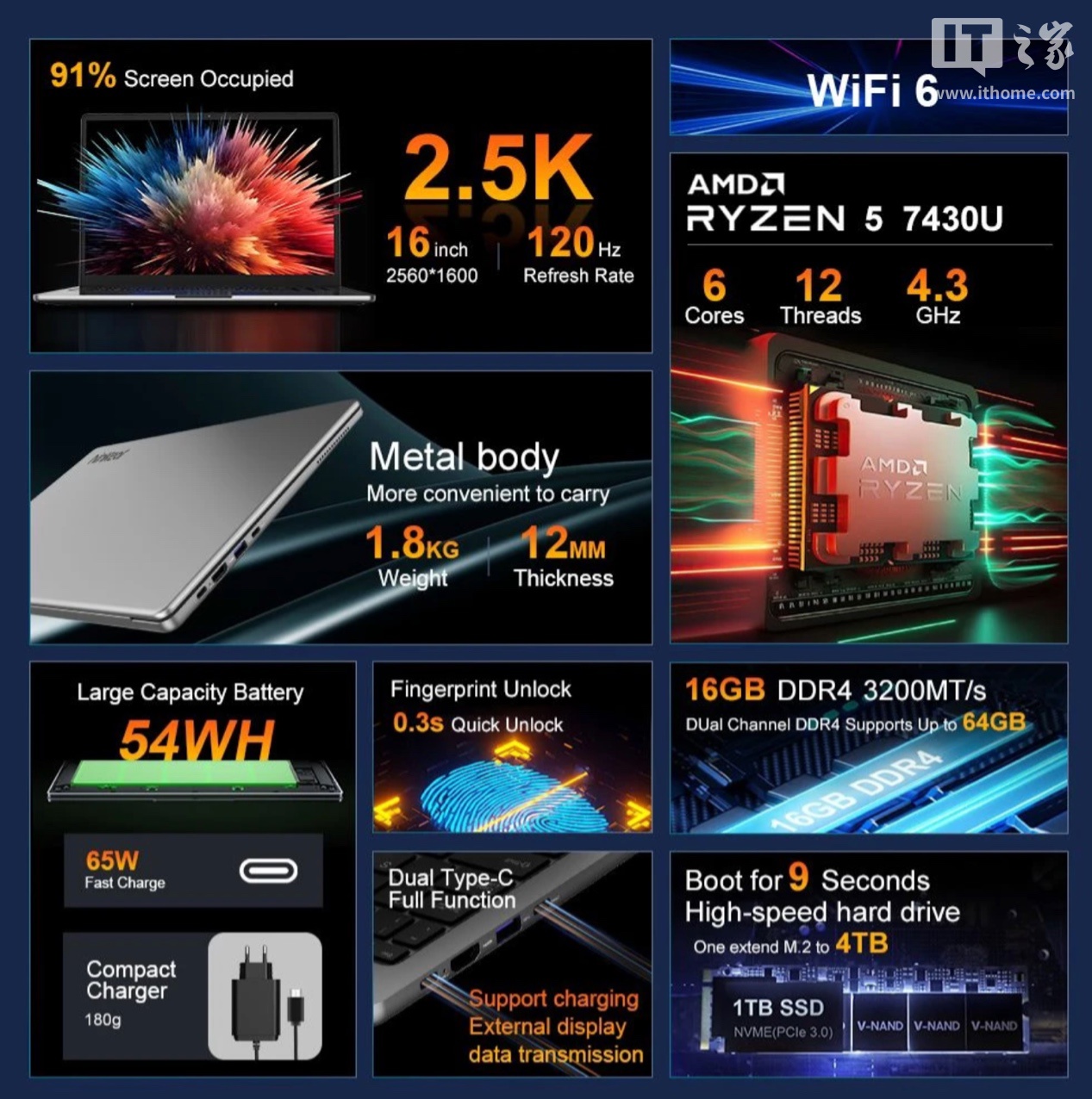 屏幕方面,该笔记本搭载了一块 16 英寸的屏幕,分辨率为 2560*1600,刷新率为 120Hz,覆盖 100% sRGB 色域,最高亮度可达 400 尼特;内置 54Wh 电池,支持 65W 快充。