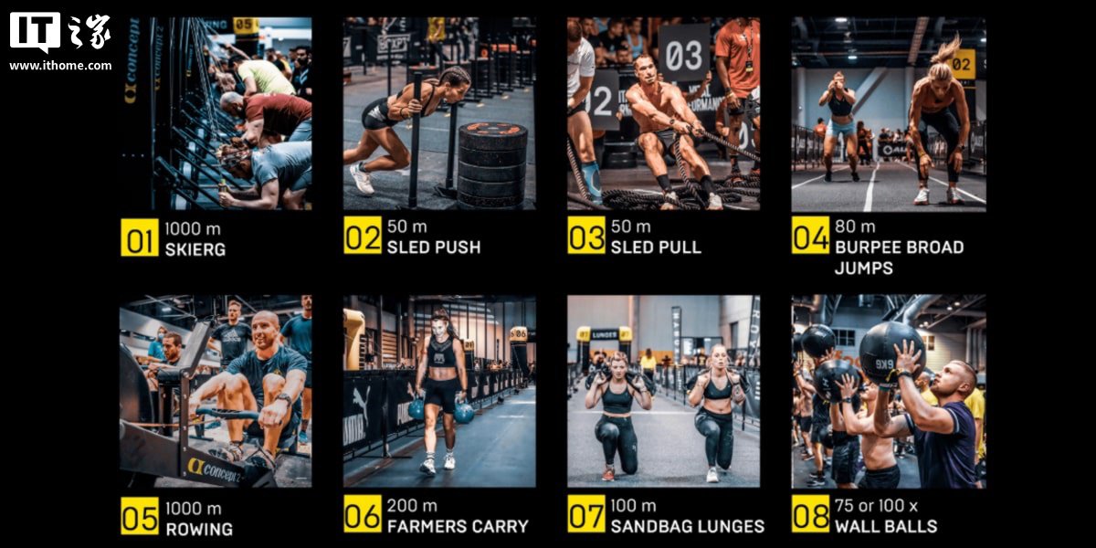 IT之家备注:HYROX 是一项室内健身跑赛事,将跑步与 8 种健身项目(滑雪机、推雪橇车、拉雪橇车、波比跳远、划船机、农夫行走、负重箭步蹲、投掷药球)融合;每一位参加 HYROX 比赛的选手共需交替完成 8 公里跑和 8 组健身动作:从起点竞速跑 1 公里后,按照顺序在指定的功能区完成第 1 组健身动作,完成动作后再竞速跑 1 公里后完成第 2 组,以此类推,直至抵达终点。